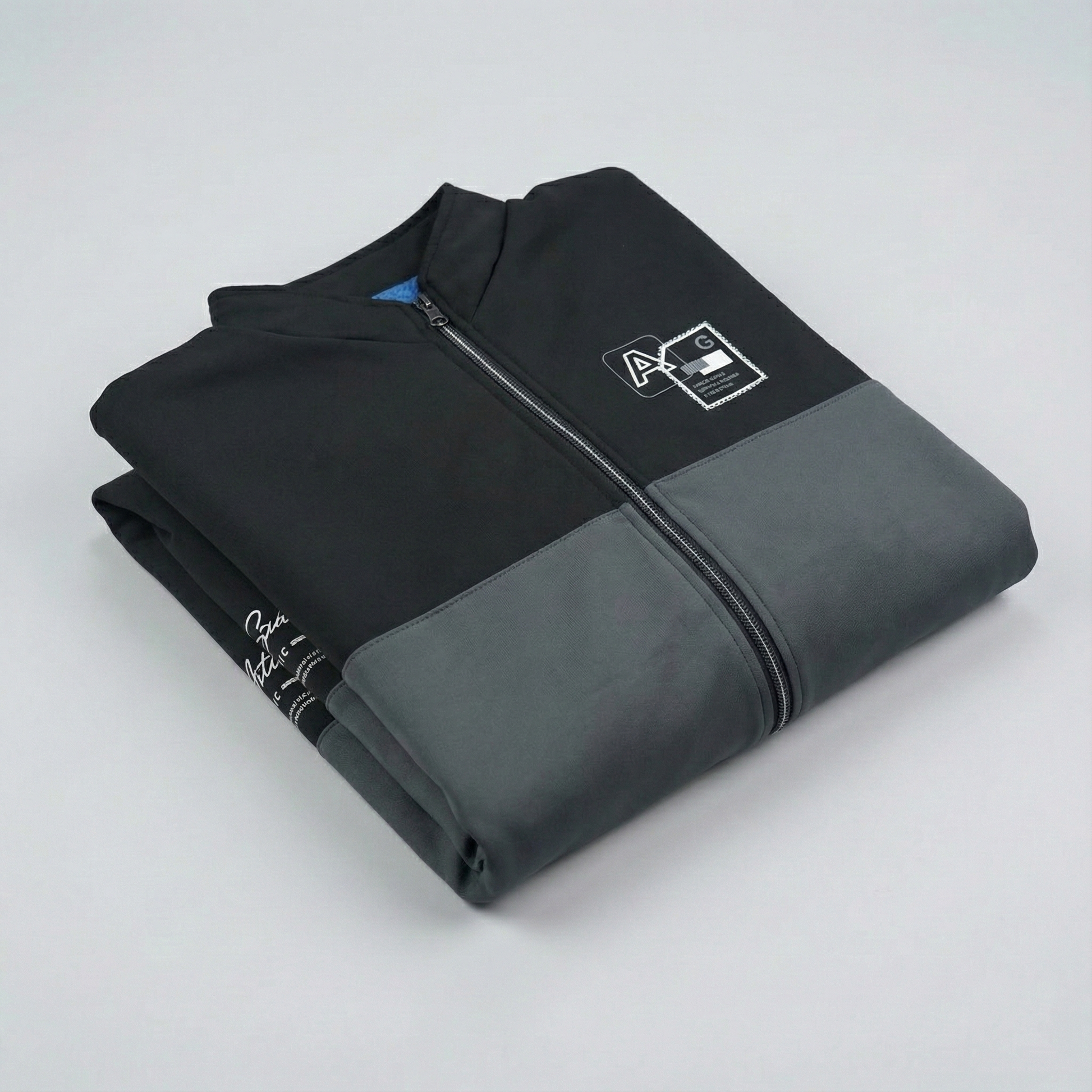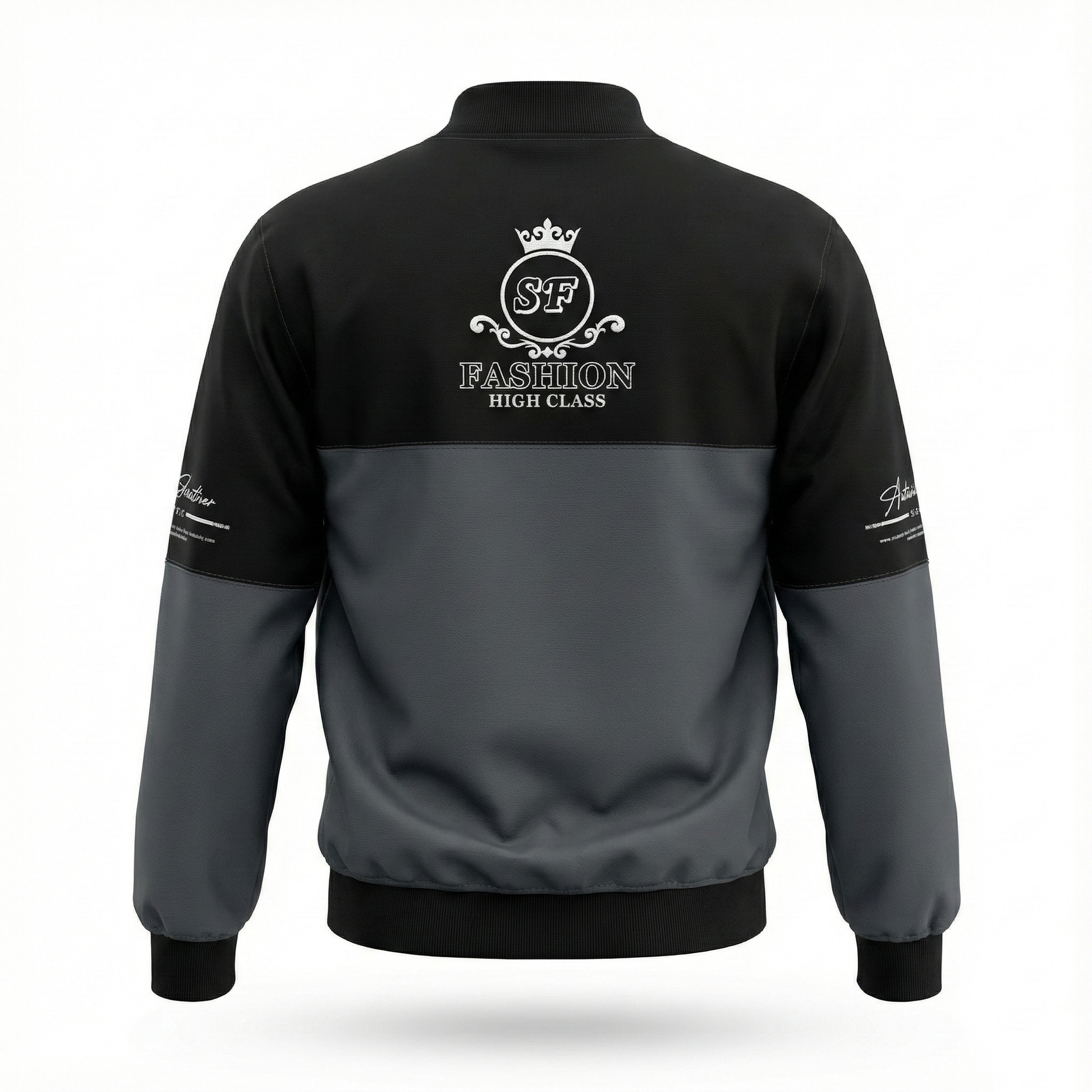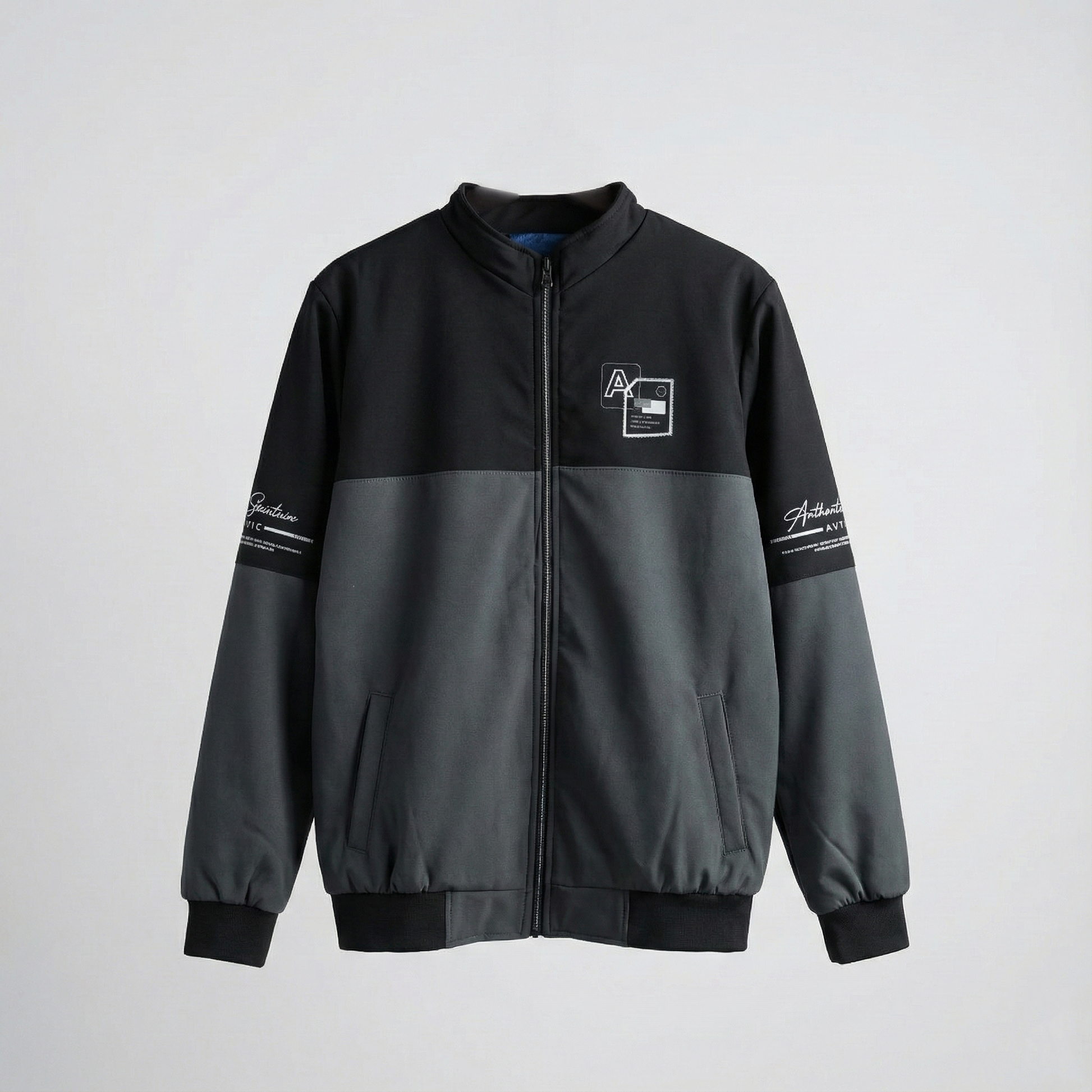 The black and grey color combination gives the jacket a smart, versatile appearance that pairs easily with jeans, chinos, or casual trousers. Subtle printed details on the front, sleeves, and back add character without making the design feel heavy.