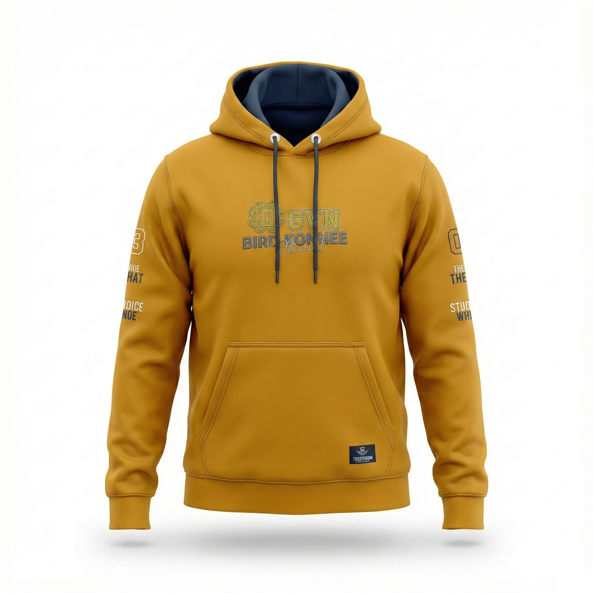 The warm mustard tone gives this hoodie a distinctive yet wearable style, while the subtle printed details on the front and sleeves add character without feeling heavy or flashy. It pairs easily with jeans, joggers, or casual trousers, making it a versatile choice for winter.